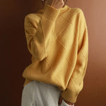 Dieser weiche Damen Rollkragenpullover überzeugt durch sein markantes Rautenmuster und den hohen Kragen. Ideal für kühle Tage im Herbst und Winter, bietet er angenehme Wärme und einen modernen Look für Alltag und Freizeit.